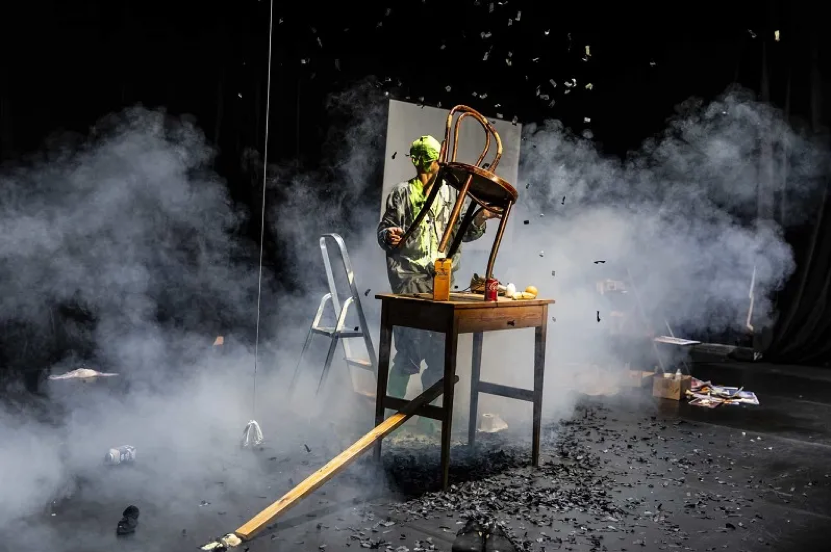 The performance combined elements of stand-up comedy and a denunciatory monologue, and was brought to life by the rhythm and music foregrounding the character’s achievement. Also, of interest was the visual aesthetic enhanced by the effective use of lighting, props and settings, taking us first to a bar and then to a company office, with the manager’s empty jacket hanging in mid-air, full of connotations.