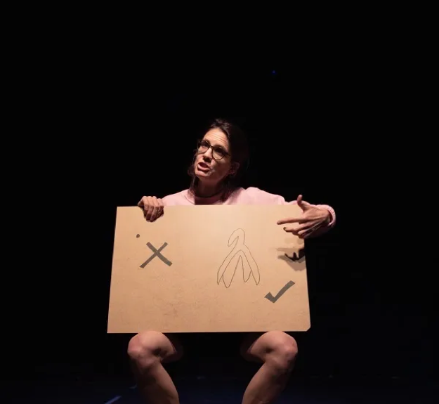 The core of her concerns is deftly illustrated by the clever use of props, such as a blackboard on which she jots questions/issues which she then erases when it’s time to move on, and the cardboard boxes which signal the intention to organize her life and her repertory of movement. However, the narrative or discursive development of the key questions raised lacks innovation and an element of surprise that could have been created, had the direction of the piece avoided cliché, which detracted from the actor’s vitality and expressive capability.