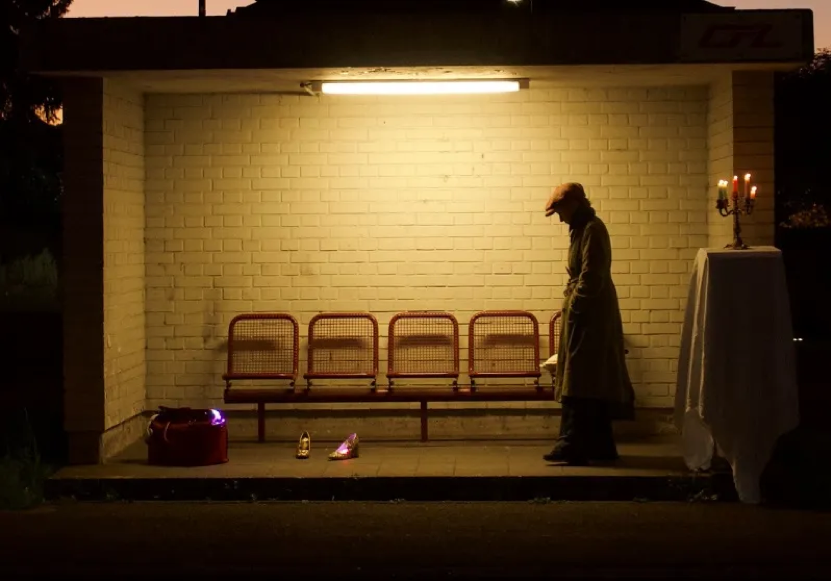 Bodson was very consistent in the realistic depiction of her character’s mood changes; she built a rhythm with her voice and body which allowed her to illuminate the range from irony and humor to melancholy and anxiety, while making discerning use of the non-textual components of her monologue. Out of her props – suitcases, a sleeping bag, a tablecloth as decoration of her street bench, the emblematic red Dior handbag of the title – the actor builds a mini universe that is both familiar and unsettling for the complaisant viewer.
